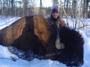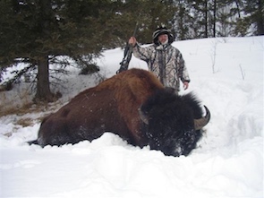 It was mid morning, I looked down on the frozen pond and saw fresh tracks, unfortunately they were running, they had heard us. I ran forward to the next meadow and saw 2 large shadows moving past the pond threw a poplar tree thicket. Now the trail was smoking hot and we saw the steaming piles of buffalo dung on frozen ground as we followed slowly in the knee deep snow. After a mile or so I could see the animals had started to meander and a bull was destroying small spruce trees, we had to be close! Up ahead, past a spruce swamp, I saw movement. I stripped of my heavy Raven Ware parka, and did a quick equipment check and entered hunt mode. They seemed to spook again so I hurried off their trail to the right to an opening that let me see further in front of the swamp to an opening in the trees. I saw one enter the open area and braced on a tree, only a cow but they seemed calm and unaware. I checked her through the scope, I could see the rest of the small herd, 8 or so moving into view, it amazed me how close we were and still how hard it was to pick out a bull. He just appeared behind the first cow, that massive hump towering over her. The old cow moved out of the way but now the bull was facing away, I was getting the rush, I need him to turn. It seemed forever but finally he turned and I took a steep quartering shot, the whole herd bolted, one lagged behind. Broadside and mortally wounded the big bore barked and the 300 grain slug put him down for good. I filled with emotion as I approached the still giant; I had fulfilled a long time dream and accomplished what very few modern men have, hunted a wild bison.