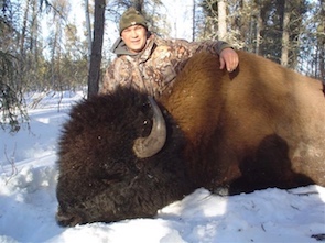 Contrary to the popular conception of a bison hunt, this may be one of the toughest hunting experiences on the continent, after a couple days in minus 36 degree weather this was very apparent. We searched for their tracks and occasionally got a glimpse of a retreating buff. When we found a fresh trail we followed them up on foot, in a similar fashion to hunting Cape buffalo in Africa except for the extreme temperatures and snow. These huge bison have been weighed at 2600 pounds and like their African counterpart a wounded bull should not be taken lightly! After 6 days of hard hunting, countless hours on a snow machine and miles of walking, Travis Peterson of Houston Minnesota got a first hand lesson on this when he downed his bison bull at a full charge with 2 shots from a .375 RUM at less than 50yds. Bison bulls may be the most dangerous game animal in North America, apart from the large bears. We often encountered them at close range and still had little opportunity at a clean shot. Earlier the same day Kevin Pearce of Fenton Michigan downed one of four dugaboy bulls that were found on a frozen lake and after a 2 hour pursuit into the dark timber made an excellent shoulder shot as the bulls bolted. Surprisingly agile A wild bison hunt is truly unique experience, not only for the trophy, but also for the opportunity to travel and hunt in this vast sub-arctic wilderness. After 2 days of full mount skinning and retrieval my American buddies headed home with the satisfaction of having hunted North America’s largest land animal and one of our western heritage’s most prominent symbols!